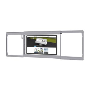 Con la dotazione di un meccanismo motorizzato, che letteralmente apre e chiude due ante frontali, adibite alla scrittura con pennarelli colorati per lavagna bianca, la soluzione (quanto le ante sono chiuse) nasconde interamente il display e diventa un unico spazio di scrittura, mentre (in modalità aperta) rivela il monitor e permette la scrittura ai lati potendo integrare contenuti digitali ad annotazioni di tipo tradizionale.