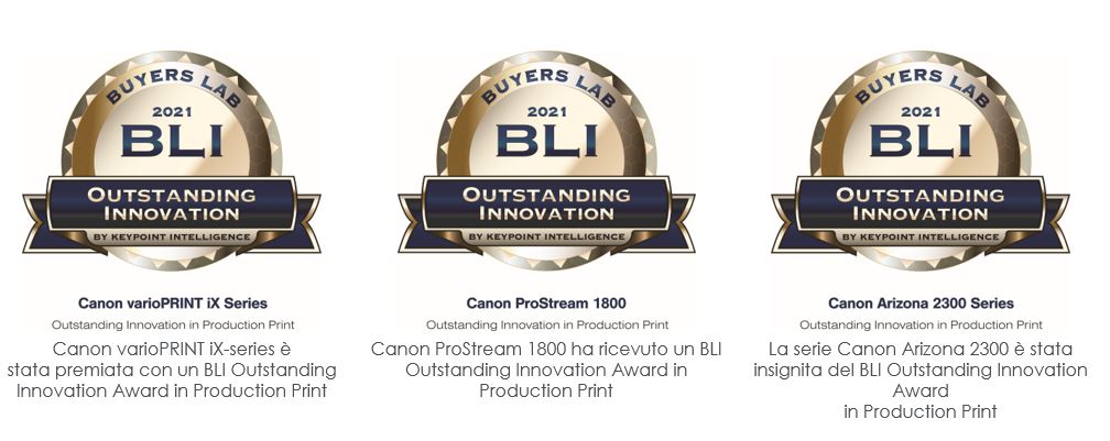 Keypoint Intelligence ha riconosciuto i progressi compiuti da Canon nel settore della stampa di produzione annunciando il conferimento dei BLI Outstanding Innovation Awards in Production Print a tre prodotti Canon: la stampante inkjet a foglio singolo varioPRINT iX-series, la stampante inkjet ad alimentazione continua ProStream 1800 e la stampante piana serie Arizona 2300. I prodotti vincitori “integrano tecnologie che migliorano la qualità della stampa, incrementano la produttività, ottimizzano il flusso di lavoro, contribuiscono alla sostenibilità e promuovono in modo significativo i loro segmenti di prodotto.”