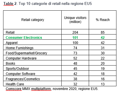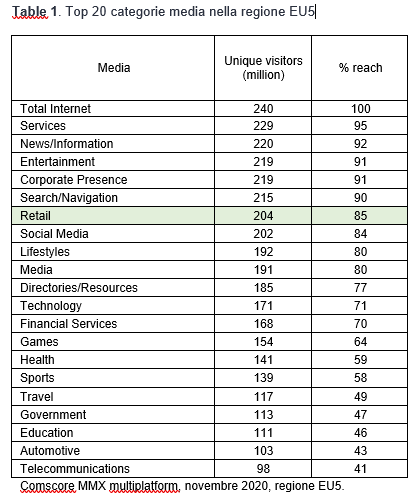 L’ultimo trimestre dell’anno è il più importante per la categoria Retail, e questo si riflette infatti nei dati per il 2020: nella più recente classifica Comscore delle prime 20 categorie di media più visitate, il Retail detiene la quinta posizione. Nel mese di novembre 2020, oltre 200 milioni di visitatori unici, ovvero l’85% della popolazione digitale della regione EU5, ha visitato un sito web o app mobile di retail. Mentre puri player digitali come Amazon, eBay, Alibaba e Wish tendono a dominare le classifiche, anche i rivenditori fisici si stanno ritagliando una quota di mercato sempre più significativa. Esempi ne sono IKEA, Carrefour Group, Sainsbury’s e DSG retail e Otto Gruppe.