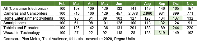 Come mostra la tabella seguente, i comportamenti online misurati nel Regno Unito nel 2020 riflettono in gran parte questo fenomeno: il numero di persone che hanno visto almeno 5 pagine di contenuti relativi all’elettronica di consumo e ai suoi vari componenti (Home Entertainment, Smartphone, Tablet ed E-reader e Wearables) tende ad aumentare a settembre e ottobre di ogni anno.