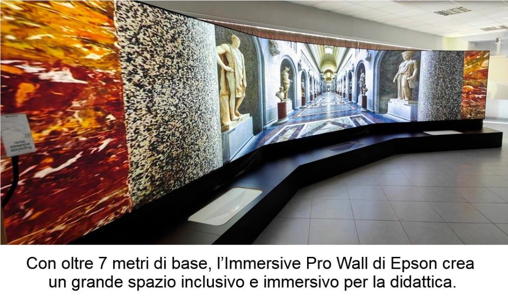 - Immersive Pro Wall: la nuova soluzione per gli ambienti immersivi che crea una grande superficie di proiezione superiore ai 7 metri di base per immergersi nei contenuti e interagire con i materiali didattici. Utilizza 3 proiettori a ottica ultra-corta EB-815E e schermi ELPSC36 Ambient Light Rejection da 120″. Ideale anche per gli I.T.S. che necessitano di uno spazio di simulazione;