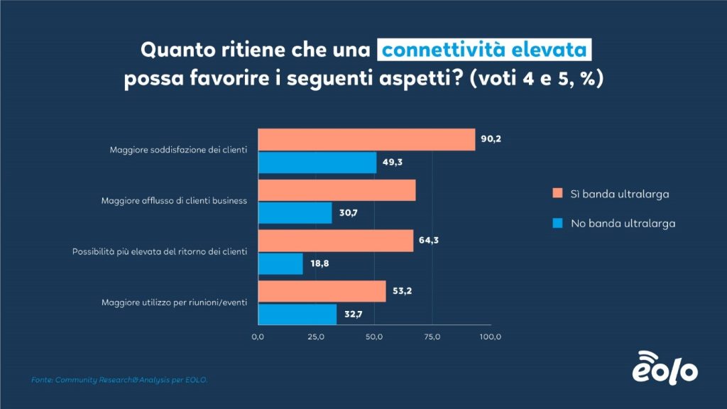 Ancora, più della metà delle realtà connesse reputa importante il ruolo giocato dalla banda ultralarga nel vedere le proprie strutture maggiormente utilizzate per riunioni o eventi. Una percentuale che scende al 32,7% tra le aziende che non dispongono di questo tipo di connettività.