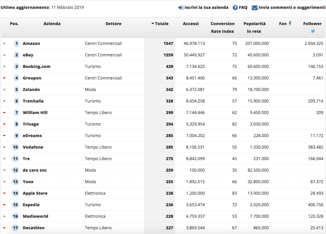 Stando alla classifica, oltre ad aver superato peer e competitor, all’11 febbraio 2019, l’insegna risulta al 16° posto assoluto nella classifica dei 100 siti di e-commerce più popolari di Italia.
