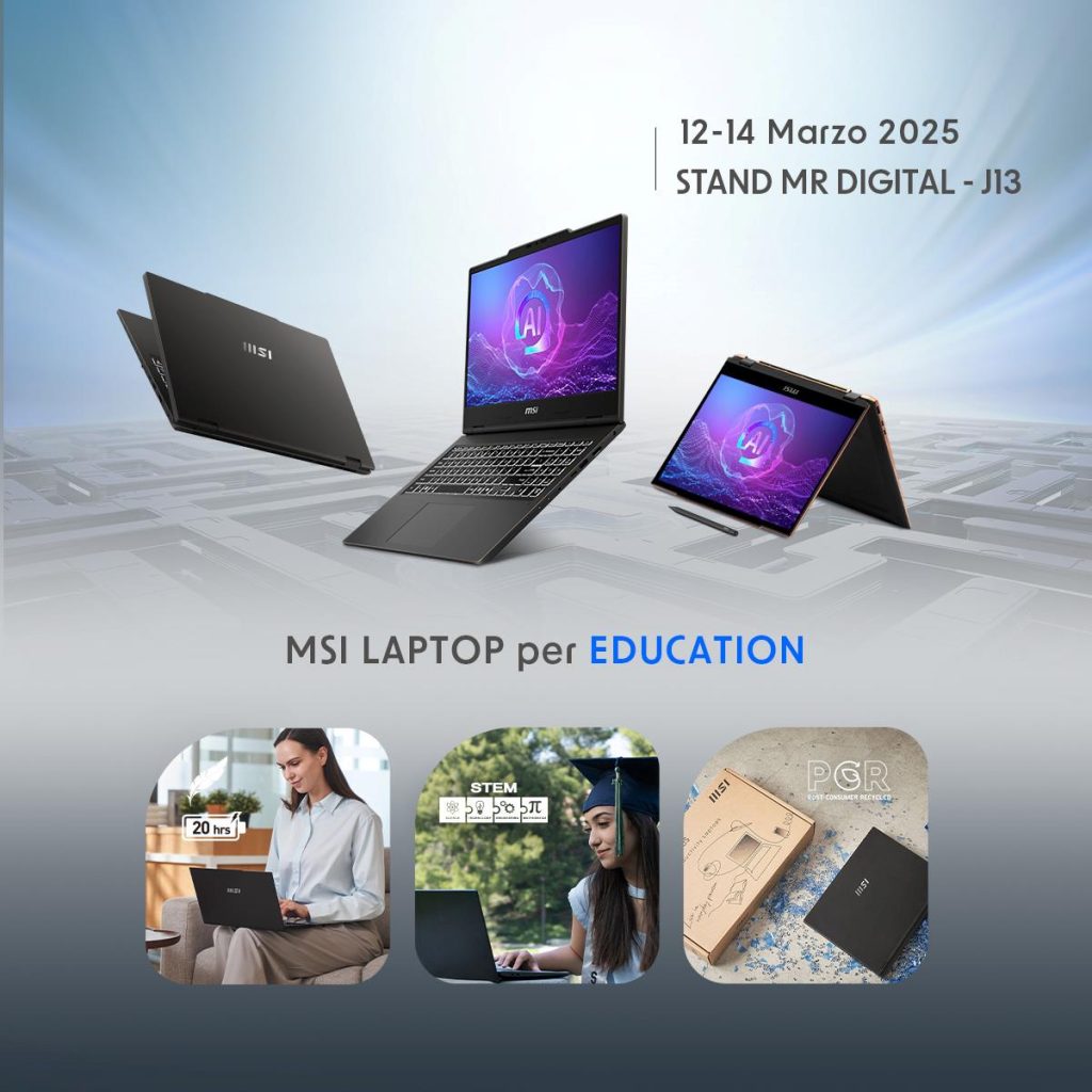 Allo stand dell’azienda si potrà scoprire una selezione di prodotti per studenti e docenti e anche partecipare a diverse attività formative e di approfondimento per scoprire come i prodotti possono trasformare l’apprendimento nelle scuole, offrendo soluzioni innovative e performanti per studenti e docenti: il 12 marzo alle 11:30 si terrà il workshop “I prodotti MSI per il mondo Scuola e l’uso del Coding”, mentre alle 15:00 inizierà l’incontro dal titolo “La gamification per la formazione B2B” e alle 16:00 inizierà l’evento “L’intelligenza artificiale nell’era della Digitalizzazione Scolastica”; il 13 marzo alle 9:30 si parlerà di AI durante l’incontro “L’intelligenza artificiale e MSI” e, dalle 11:00, durante il workshop “L’intelligenza artificiale nell’era della Digitalizzazione Scolastica”, mentre alle 15:00 MSI e Niva Scuola Digitale daranno vita all’incontro “Tecnologia e Didattica: Il Ruolo delle Aziende Tecnologiche nel Futuro della Scuola”; il 14 marzo, infine, sarà possibile partecipare al workshop “MSI e la realtà virtuale con META” delle 11:00, all’appuntamento “Tecnologia e Didattica: Il Ruolo delle Aziende Tecnologiche nel Futuro della Scuola” delle 12:00 e all’evento “L’intelligenza artificiale e MSI” che si terrà alle 14:00.