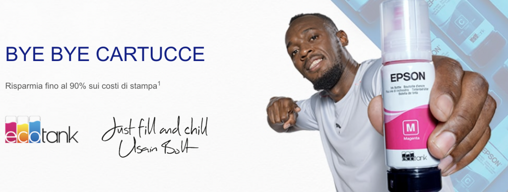 Epson ha annunciato il nuovo testimonial di Epson EcoTank: Usain Bolt, l’uomo più veloce del mondo, famoso per aver registrato il miglior tempo nei 100 metri e vincitore di 8 medaglie d’oro alle olimpiadi.