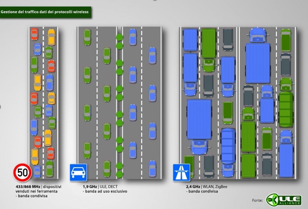 ULE impiega le frequenze protette del DECT (1880-1900 MHz), esclude quindi per natura interferenze con dispositivi basati su altri standard o con apparecchi Wi-Fi / Bluetooth, di norma ammassati sulle frequenze da 2,4 GHz o 868 MHz, cosa che potenzialmente pregiudica il buon funzionamento della rete di apparecchi per l’automazione domestica. Chi sa quanto sia difficile connettersi a Internet attraverso hotspot sovraffollati non accetterà di buon grado interferenze o eventuali congestioni del traffico dati nella propria smart home.