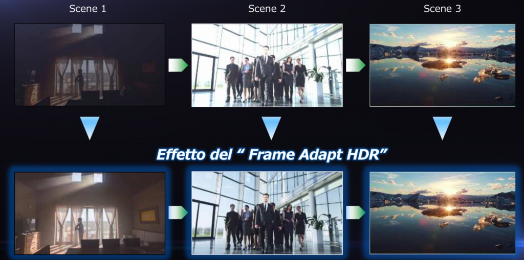 Il nuovo Frame Adapt HDR analizza istantaneamente la luminosità massima per ogni frame e scena, regolandone automaticamente la gamma dinamica. Questo rende l’HDR più performante garantendo la miglior performance a seconda del tipo di film che si sta proiettando: le immagini risultano infatti molto più vicine a quanto un occhio umano percepisce nella realtà.