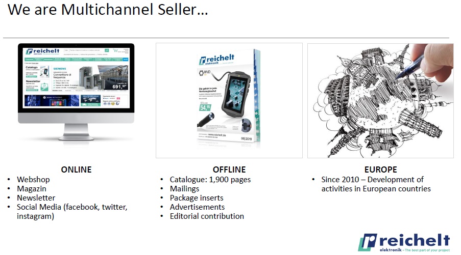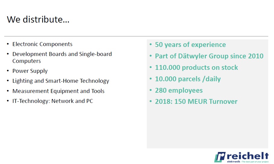 reichelt elektronik nasce nel 1969 in Germania e nel corso degli anni si espande progressivamente in Europa partendo da Austria, Svizzera, UK, Francia, Paesi Bassi, Belgio, Polonia e ora arriva in Italia. La sua offerta è veicolata attraverso canali di acquisto in sei lingue, quattro valute mentre i servizi di spedizione coinvolgono 128 Paesi in tutto il mondo.