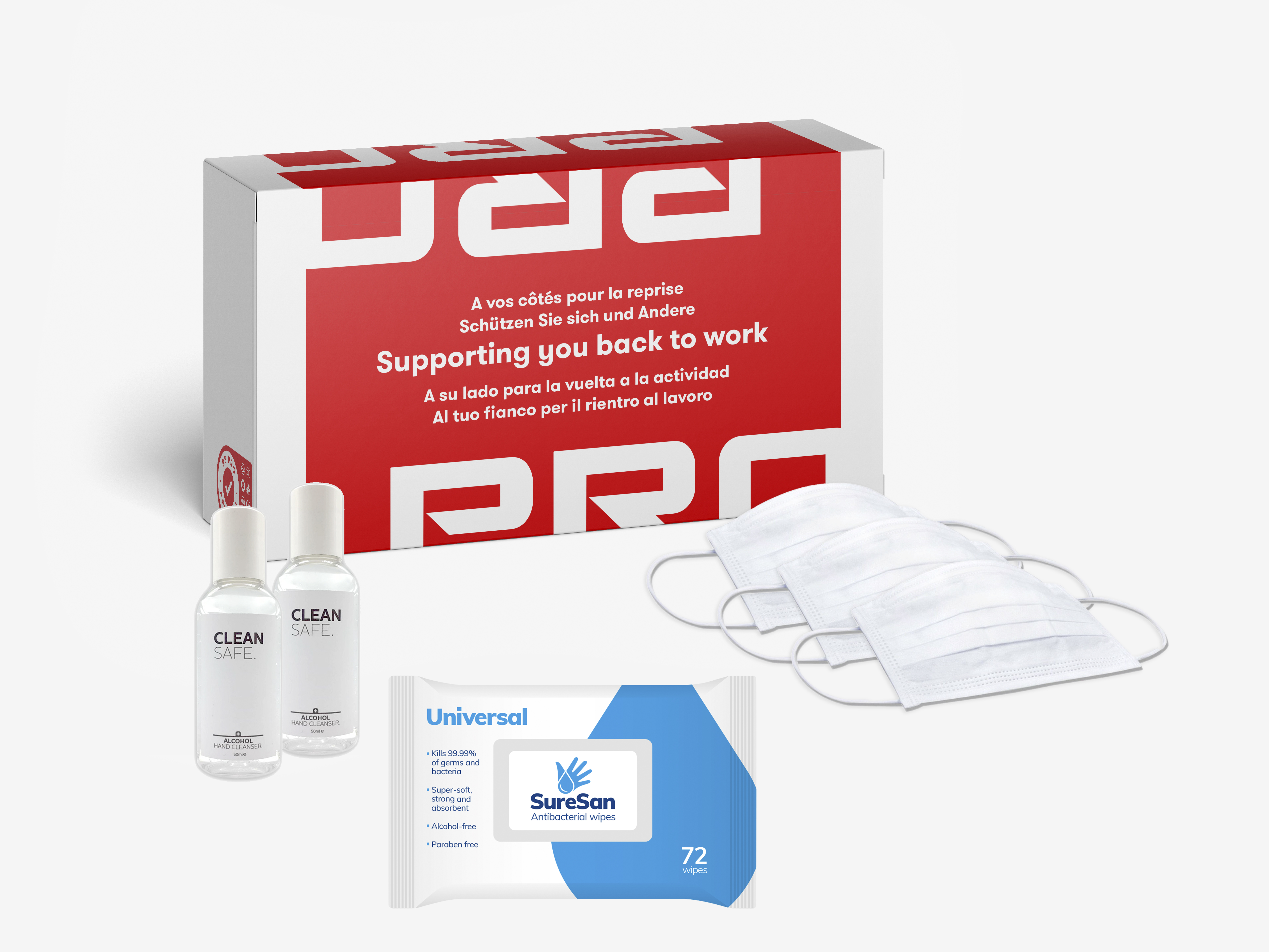 I kit di igiene individuale contengono soluzioni per ridurre al minimo la diffusione di germi e infezioni sul posto di lavoro. Questi kit di base per la prevenzione includono gel igienizzante per le mani per ridurre i batteri e uccidere i germi laddove il sapone e l’acqua non siano facilmente disponibili, mascherine facciali in tessuto non tessuto a 3 strati per uso non medicale e salviette antibatteriche.