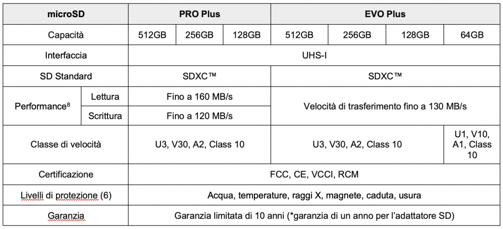 [7] La performance dichiarata è stata ottenuta usando le microSD EVO Plus con lettori Samsung.
