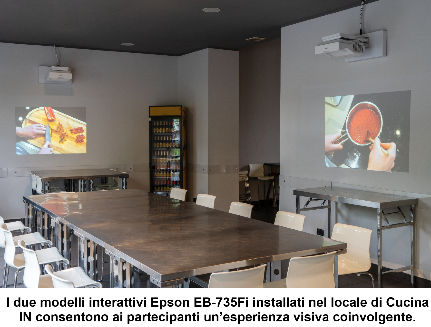 Il restyling di Cucina IN ha interessato anche la videoproiezione, con i due modelli interattivi Epson EB-735Fi utilizzati per accompagnare eventi e corsi con proiezioni dedicate a video promozionali e non solo.