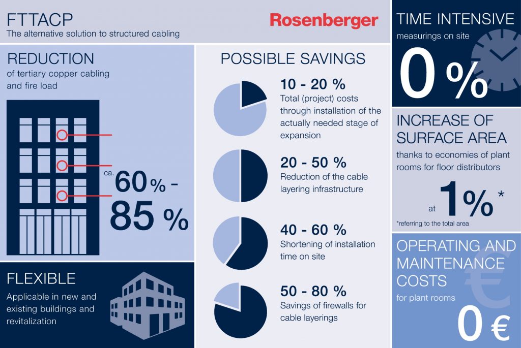L’architettura di rete innovativa PerCONNECT EcoFlex’IT sposta l’attenzione dei mezzi trasmissivi del cablaggio verso la tecnologia in fibra ottica orientata al futuro riducendo al minimo il cablaggio terziario in rame solo per i dispositivi terminali. «Il grande vantaggio in questo caso è che non sorgono problemi di riscaldamento dei cavi dovuto alla lunghezza massima dei cavi in rame di solo 25 metri nelle applicazioni PoE» afferma Stefan Wiener, Product Manager LAN di Rosenberger OSI.