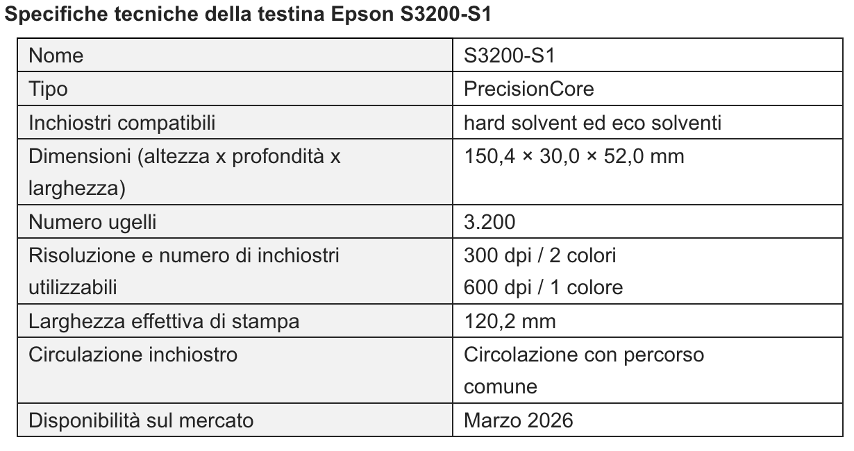Epson amplia la gamma di testine di stampa industriali con la nuova S3200-S1, progettata per l’uso con hard solvent e pensata per applicazioni di produzione su larga scala. L’ultima arrivata nella serie PrecisionCore combina ampia larghezza di stampa, alta risoluzione e grande affidabilità, contribuendo a rafforzare il ruolo della tecnologia inkjet nei settori più avanzati dell’industria, come la fabbricazione di celle solari a perovskite, l’elettronica stampata e la manifattura di nuova generazione.