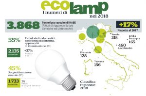 “Ecolamp si conferma protagonista del sistema RAEE, con una crescita della raccolta a doppia cifra – commenta Fabrizio D’Amico, Direttore Generale del consorzio Ecolamp -. Guardiamo con ottimismo al 2019 appena iniziato, auspicando che la recente entrata in vigore dell’Open Scope, che ha portato un aumento delle adesioni al consorzio di circa il 30%, mostri effetti ancora più consistenti e tangibili nel corso di quest’anno, a beneficio dell’intero sistema di gestione del riciclo delle apparecchiature elettriche ed elettroniche“.