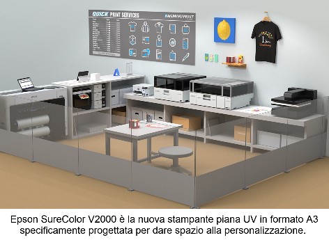 Per affrontare al meglio il cambiamento del mercato, che richiede soluzioni sempre più flessibili e capaci di fornire alle aziende elevata produttività con costi di produzione ridotti, a fianco di macchine di grandi dimensioni come la nuova ecosolvent roll-to-roll SureColor S8100, Epson si impegna da tempo nella realizzazione di stampanti dedicate alla microproduzione e alla stampa personalizzata distribuita, come la nuova piana desktop UV SureColor V2000.