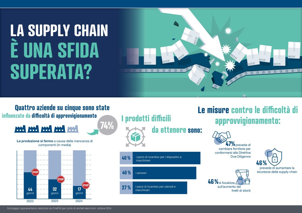 Questa realtà è dimostrata anche dai dati del più recente rapporto sulla supply chain di reichelt elektronik: la situazione delle catene di fornitura è ancora lontana dall’essersi normalizzata. Nello studio, condotto ormai da quattro anni consecutivi, 250 aziende industriali italiane sono state intervistate dall’istituto indipendente OnePoll.