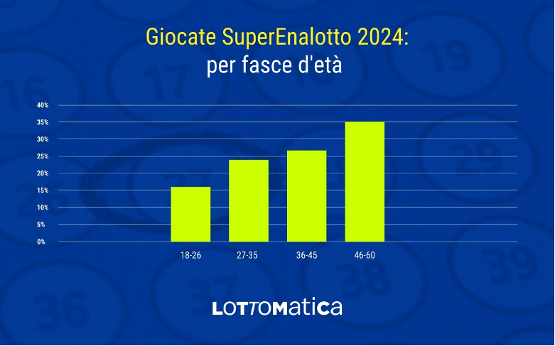 Di seguito invece i dati divisi per fasce d’età: qui, consideriamo l’aspetto delle differenze generazionali del gioco del Superenalotto. L’analisi delle giocate online del SuperEnalotto mostra una netta predominanza della fascia di età tra i 46 e i 60 anni, che costituisce circa il 35% delle schedine compilate. Anche in questo caso, la generazione X si distingue come la più coinvolta, con una partecipazione che supera di molto quella delle altre categorie di età. I dati rivelano che il 26% delle giocate proviene dal gruppo di età 36-45 anni, il 23% dalla fascia 27-35 anni e il 16% dai giocatori più giovani, tra i 18 e i 26 anni. Questo andamento conferma una tendenza già osservata per altre Lotterie: al crescere dell’età, aumenta l’interesse per il gioco.