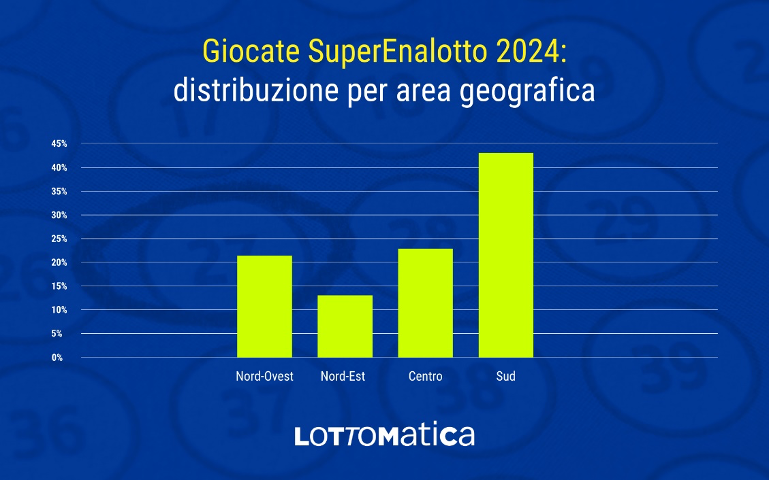 La distribuzione delle giocate in Italia offre uno spunto interessante, con il Sud che si conferma nettamente predominante. L’area meridionale, infatti raccoglie il 43% delle giocate, risultando la regione con il maggior numero di appassionati. Al secondo posto si colloca il Nord-Ovest, con una quota del 22%, un dato che suggerisce una buona partecipazione anche nelle zone più industrializzate e densamente popolate del paese. Il Centro Italia registra anch’esso il 22%, mentre il Nord-Est si posiziona all’ultimo posto con il 13% delle giocate. Questo bilanciamento tra Nord e Sud nel SuperEnalotto mette in evidenza come, nonostante le differenze geografiche e demografiche, il gioco riesca a coinvolgere ampie porzioni della popolazione in tutta Italia.