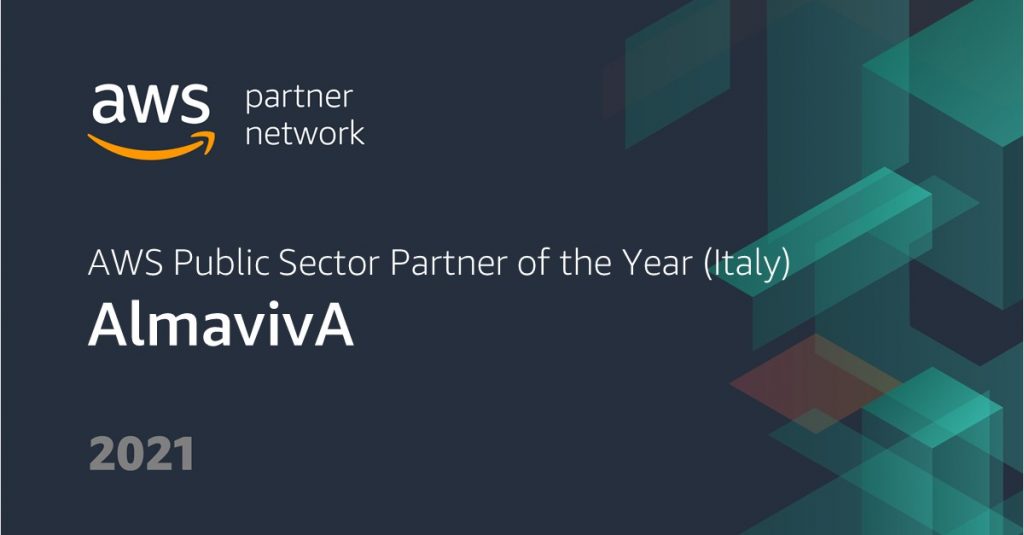 Almaviva ha vinto il premio AWS Public Sector Partner of the Year riconosciuto al partner che ha saputo meglio utilizzare i servizi AWS continuando a espandersi e a crescere con AWS nel settore Public Sector nel corso del 2020.