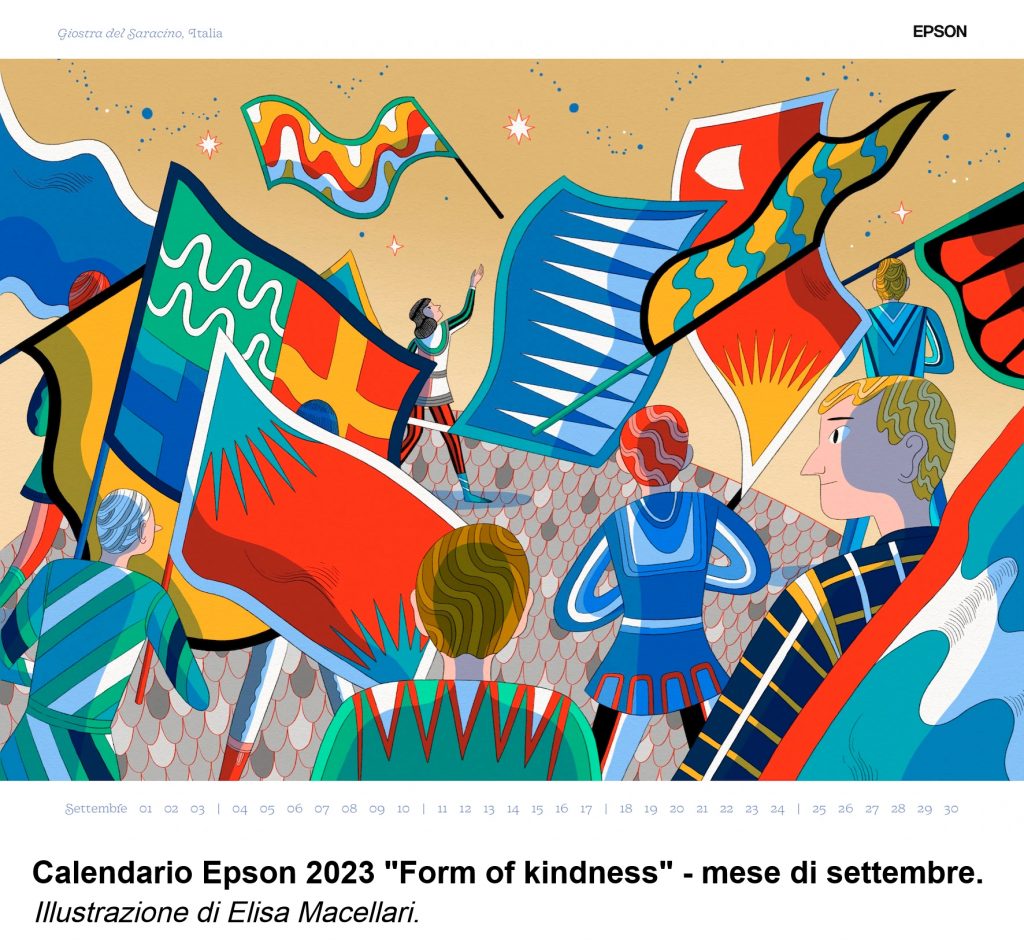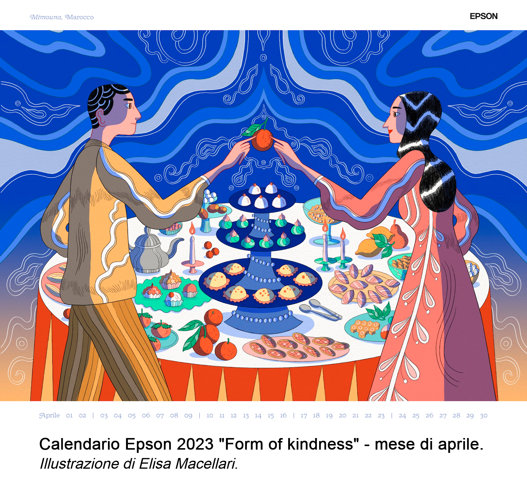Come commentato da Gianluca Folì, Art Director della Collana dei Calendari Epson dedicata all’illustrazione: «Elisa Macellari interpreta la terza edizione del Calendario Epson con il suo linguaggio ricercato, esotico, contemporaneo. È un viaggio che passa attraverso grandi eventi mondani sparsi per il mondo, ma che al contempo sono uniti da un unico elemento. Questo elemento che sa scorrere nel tempo, Elisa ci invita a cercarlo, grazie al sapiente uso cromatico e al ritmato segno narrativo, scoprendolo finalmente nel dettaglio che sta dietro ogni persona, ogni evento, ogni elemento della composizione: la gentilezza».