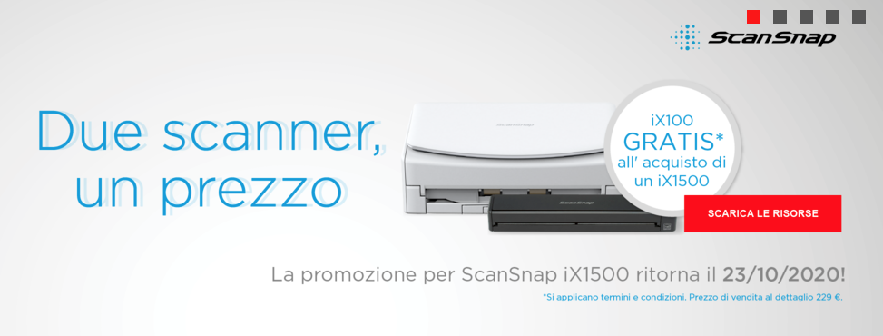 PFU EMEA ha annunciato la campagna “Double Take” per aiutare i rivenditori, distributori e partner ad aumentare le vendite delle pluripremiate soluzioni ScanSnap. Da subito, e fino al 31 gennaio 2021, i clienti potranno ricevere in regalo uno ScanSnap iX100 con l’acquisto di uno ScanSnap iX1500, garantendo un sistema più intelligente di lavorare con il proprio team.