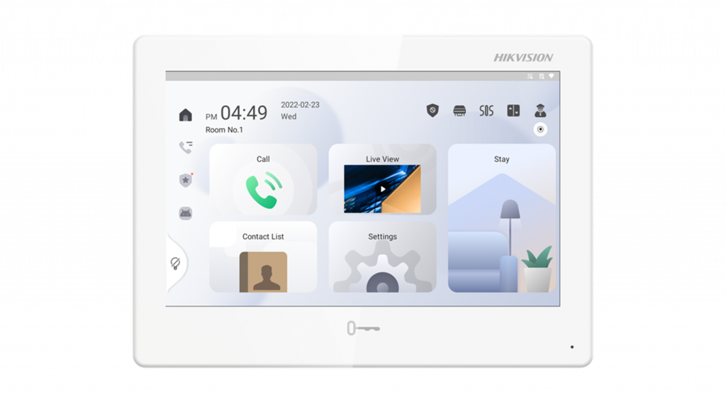 Il nuovo supervisore si allinea poi alle funzionalità presenti nelle tradizionali postazioni interne Intercom Hikvision, inserendo anch’esso la possibilità delle descrizioni dei posti esterni nella pagina live view e la gestione diretta delle due uscite a bordo (una relè e l’altra I/O). Viene mantenuta la possibilità di collegare fino a 5 estensioni sotto un’unica chiamata.