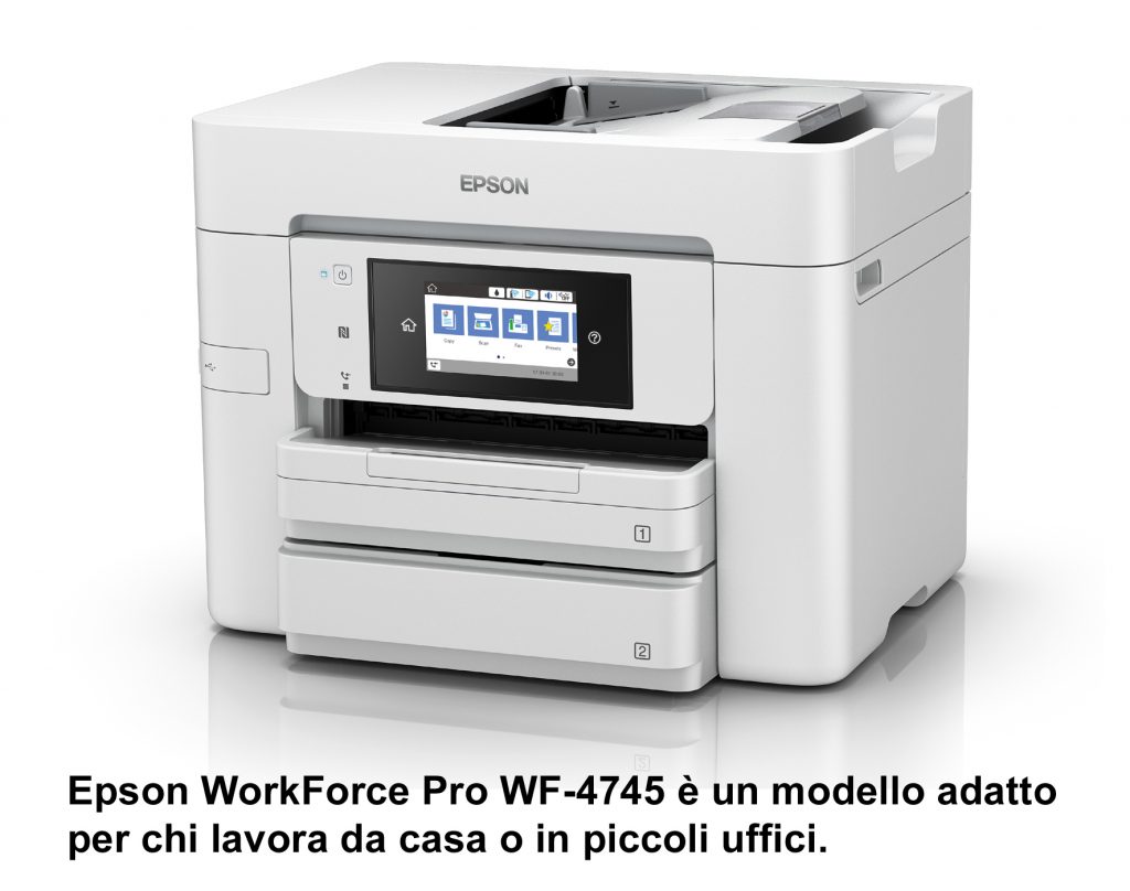 Con pratiche cartucce di inchiostro ad alta capacità, il modello WF-4745 è il multifunzione Epson a colori più conveniente della famiglia WorkForce, in grado di effettuare stampe di qualità professionale a una velocità massima di 24 pagine al minuto. Inoltre, grazie ai due cassetti che contengono oltre 500 fogli, contribuisce ad aumentare l’efficienza e a ridurre la frequenza di rifornimento della carta. È inoltre dotato di un display LCD touch screen per una facile navigazione fra le funzioni disponibili e di un alimentatore automatico di documenti da 50 pagine per digitalizzare o inviare via fax documenti solo fronte o fronte/retro in modo rapido e semplice.
