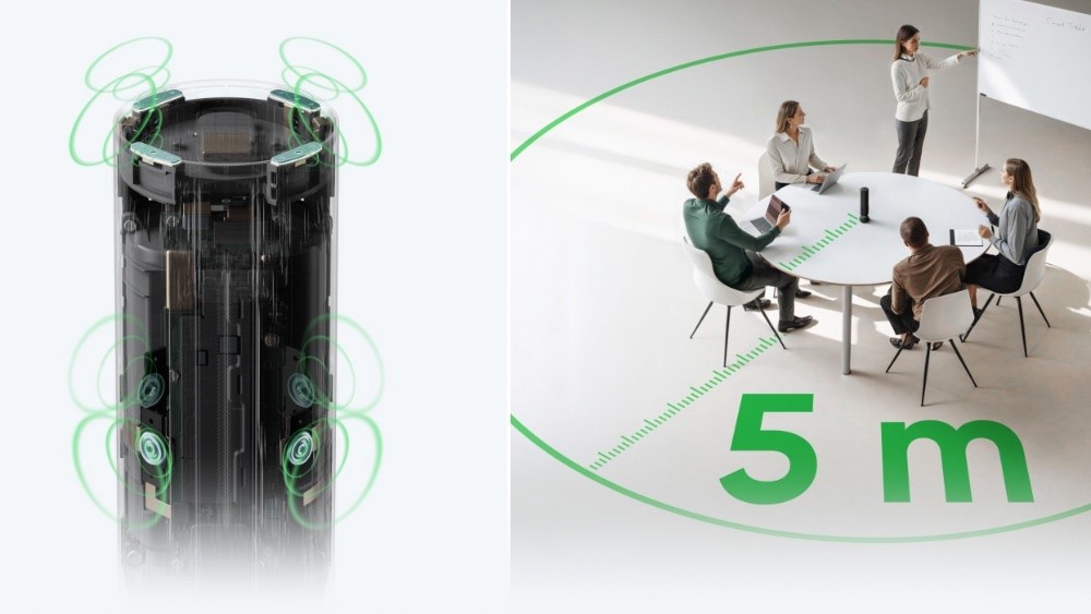 Grazie al suo array 3D a 8 microfoni, fornisce un’acquisizione vocale dettagliata in Hi-Fi a 48 kHz, fino a 5 metri di distanza. La riduzione del rumore IA elimina oltre 300 tipi di suoni di sottofondo: dal ticchettio della tastiera ai rumori della strada.