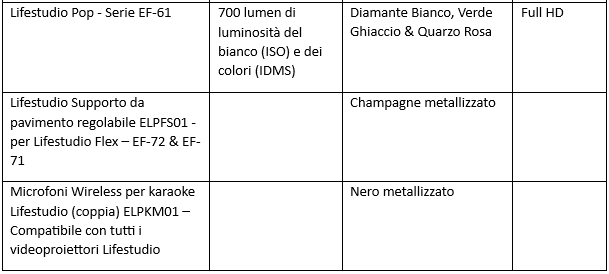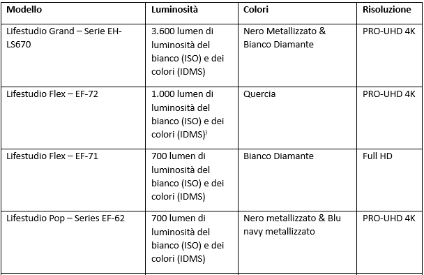 - Lifestudio portatili: i videoproiettori portatili Lifestudio includono i modelli Lifestudio Flex e Pop, che uniscono alla versatilità un design moderno, la nuovissima tecnologia 3LCD a 3 chip e il motore Triple Core Engine di Epson per proiettare immagini luminose fino a 150 pollici con risoluzione 4K PRO-UHD o Full HD. Utilizzano la tecnologia Sound by Bose per un audio chiaro e avvolgente nonostante le dimensioni compatte del videoproiettore: non sono necessari altoparlanti aggiuntivi e, con quattro modalità audio appositamente predisposte, è possibile scegliere l’impostazione audio perfetta per dare più vita a ciascun tipo di contenuto. La configurazione intelligente istantanea garantisce una messa a fuoco, un colore e un allineamento perfetti in pochi secondi. I modelli Lifestudio Flex sono dotati di un elegante supporto inclinabile integrato e di un’illuminazione ambientale integrata.