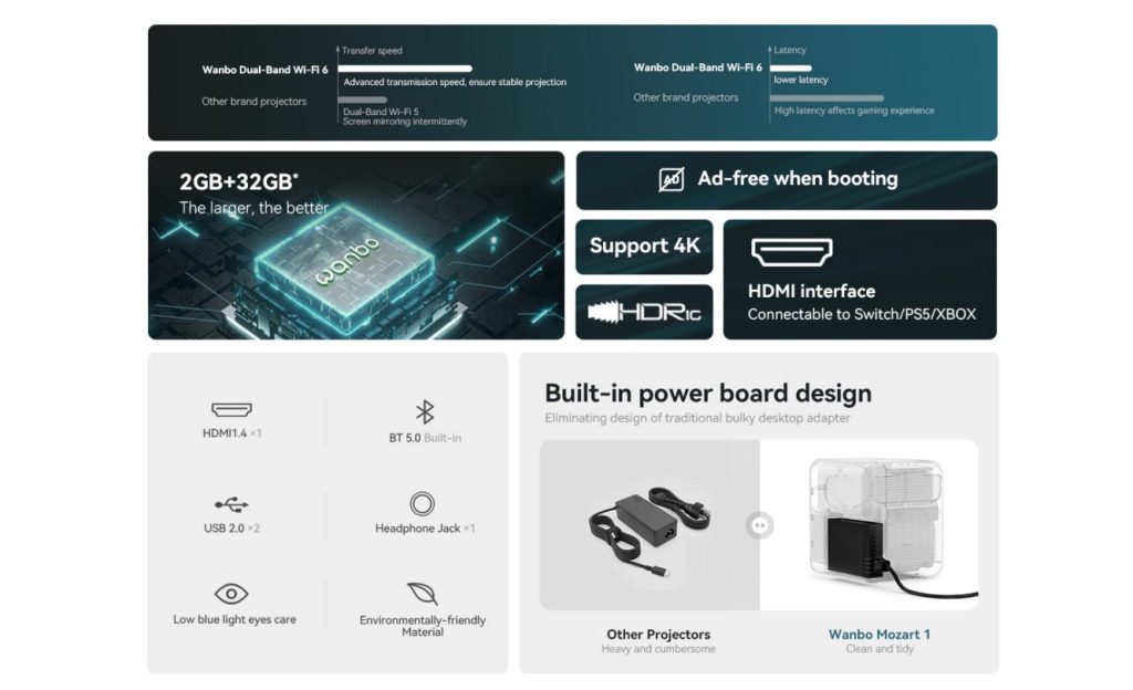 Infine il Wanbo Mozart 1 è dotato di WIFI a doppia banda 2.4 + 5G di sesta generazione, con 2 + 32G di memoria. E di una modalità di protezione visiva con riflessione diffusa a bassa luminosità blu integrata.