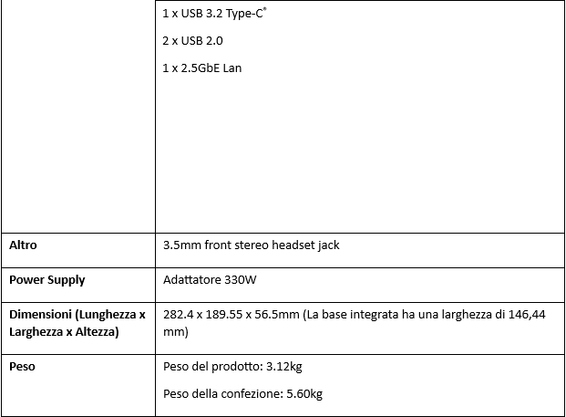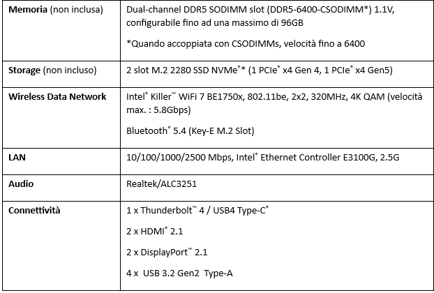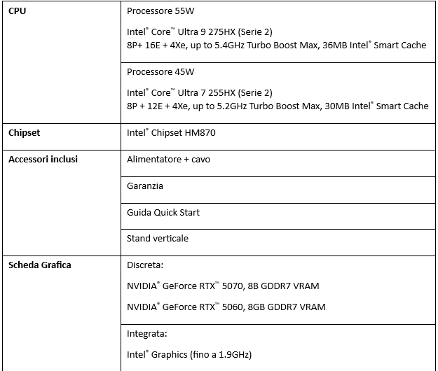 La connettività integrata Intel Killer Wi-Fi 7 garantisce velocità di trasferimento fino a 2 volte superiori rispetto allo standard WiFi 6, mentre il protocollo Bluetooth 5.4 assicura connessioni rapide e stabili. Gli utenti possono così contare su una capacità di streaming particolarmente fluida ed esperienze di collaborazione senza latenze per flussi di lavoro all’insegna della massima efficienza.