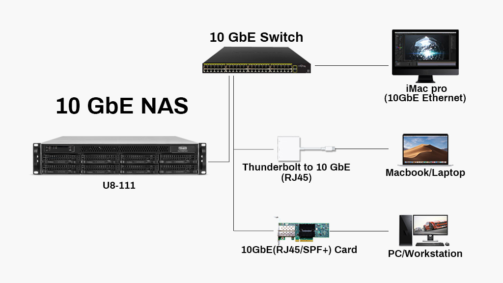 U8-111 migliora notevolmente l’efficienza dell’ufficio aziendale aggiornando l’ambiente di rete con collegamento Ethernet da 10 Gb, senza richiedere un aumento del budget aziendale. È il prodotto NAS (Network-Attached Storage) a 8 vani più conveniente sul mercato. È ideale per applicazioni che richiedono la gestione di grandi quantità di dati e velocità elevate, come l’editing video 4K.