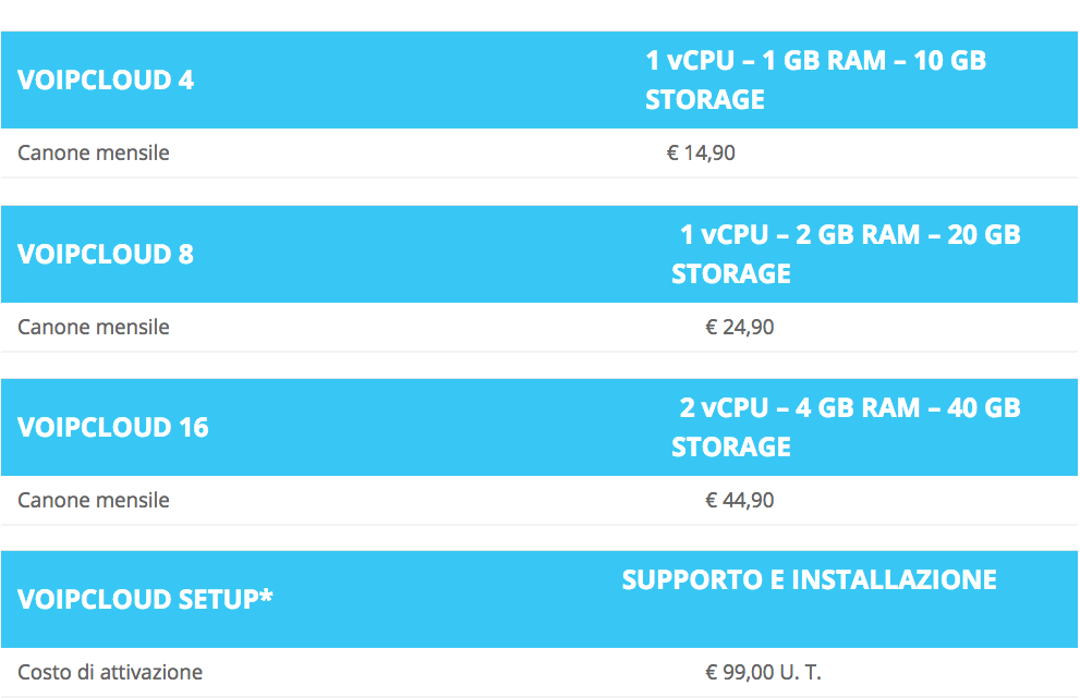 Il VoipCloud è strutturato in tre tagli, VoipCloud 4 –VoipCloud 8 –VoipCloud 16, che differiscono non solo per il numero di chiamate